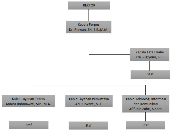 kami memiliki struktur kepengurusan perpustakaan radi Rektor Universitas Janabadra, Kepala Perpustakaan, hingga staf.